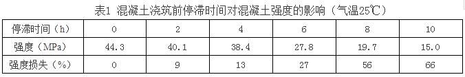(6)在初凝時(shí)間內(nèi)的混凝土,由于氣溫較高、運(yùn)距較遠(yuǎn)、壓車時(shí)間較長(zhǎng)等造成混凝土坍落度損失較大,可通過試驗(yàn)添加同型號(hào)的泵送劑或減水劑,但添加與原先已加的總和摻量不能超過外加劑最大摻量的20%。應(yīng)逐漸添加,先少加,摻入后,攪拌運(yùn)輸車必須快速轉(zhuǎn)動(dòng)2min左右,測(cè)定坍落度符合要求。運(yùn)到現(xiàn)場(chǎng)的混凝土不能立即卸料,應(yīng)快速轉(zhuǎn)動(dòng)運(yùn)輸車2min后卸料,以確保坍落度和質(zhì)量。對(duì)超過初凝時(shí)間的混凝土應(yīng)廢棄,不能再使用?;炷翝仓巴臅r(shí)間越長(zhǎng),混凝土強(qiáng)度損失越嚴(yán)重(如表1),應(yīng)當(dāng)引起足夠重視。