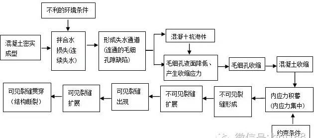 作者在攪拌站成立之初的抗裂實(shí)踐中,對(duì)這些現(xiàn)象也深感困惑。直到后來(lái)明確了早期裂縫是因?yàn)榛炷潦^(guò)多所致,并對(duì)這一機(jī)理進(jìn)行了深入研究,才重新認(rèn)識(shí)了混凝土收縮裂縫形成的全過(guò)程,如圖1[5]所示。