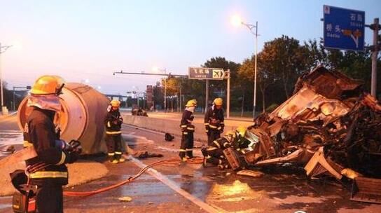 到達現(xiàn)場后,消防官兵經過現(xiàn)場偵查發(fā)現(xiàn)水泥攪拌車與路中央護欄猛烈碰撞。事故中,攪拌車車頭損毀嚴重,車頭零部件散落一地,攪拌車司機被變形的車頭緊緊卡住,無法動彈,情況萬分危急。了解情況后,消防官兵決定利用液壓擴張器和撐頂桿對駕駛室變形部位進行破拆,對被困人員實施營救,并做好現(xiàn)場警戒,防止發(fā)生二次事故。