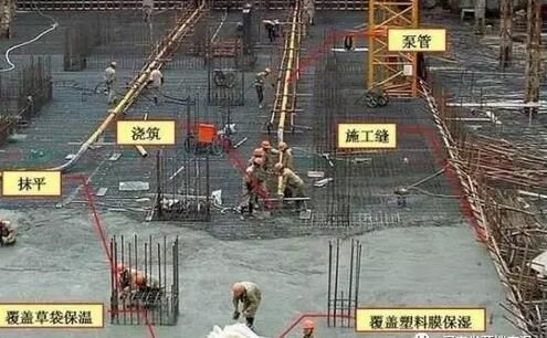 6、大體積泵送混凝土經(jīng)振搗后表面水泥漿較厚,容易引起表面裂縫。首先,要求在振搗最上一層混凝土?xí)r,控制振搗時(shí)間,注意避免表層產(chǎn)生太厚的浮漿層;在澆搗后,必須及時(shí)用2m 長(zhǎng)括尺,將多余浮漿層刮除,按照標(biāo)高控制點(diǎn),將混凝土表面括拍平整。有凹坑的部位必須用混凝土填平,在混凝土收漿接近初凝時(shí),混凝土面進(jìn)行二次抹光,用木蟹全面仔細(xì)打抹兩遍,既要確?;炷恋钠秸龋忠哑涑跗诒砻娴氖湛s脫水細(xì)縫閉合,在混凝土收漿凝固施工期間,除了具體施工人員外,不得在未干硬的混凝土面上隨意行走,收漿工作完成的面必須同步及時(shí)覆蓋薄膜。