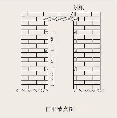 當(dāng)內(nèi)墻為砌體時(shí),應(yīng)沿門洞口兩側(cè),采取灰砂磚或水泥磚或C20混凝土預(yù)制塊,以每隔500~600mm間距替換加氣磚;門洞兩側(cè)自離地500起,采取灰砂磚或水泥磚或C20混凝土預(yù)制塊。
