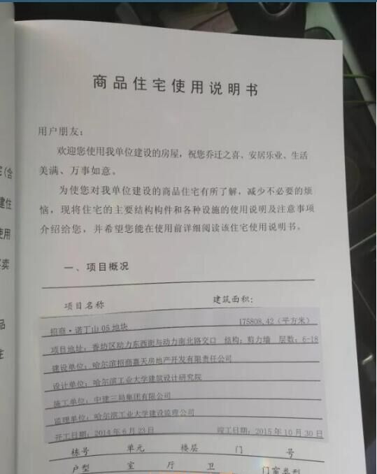 在哈爾濱市城鄉(xiāng)建設(shè)委員會官方網(wǎng)站上,記者查到了“招商諾丁山 05 地塊 8#樓”的《哈爾濱市工程竣工驗收備案證》,備案號為黑建備字號2015380,建設(shè)單位為哈爾濱招商嘉天房地產(chǎn)開發(fā)有限責(zé)任公司,施工單位為中建三局集團(tuán)有限公司,監(jiān)理單位為哈爾濱工業(yè)大學(xué)建設(shè)項目管理公司,開竣工日期為2014年6月15日-2015年12月18日,備案日期2015年12月18日。