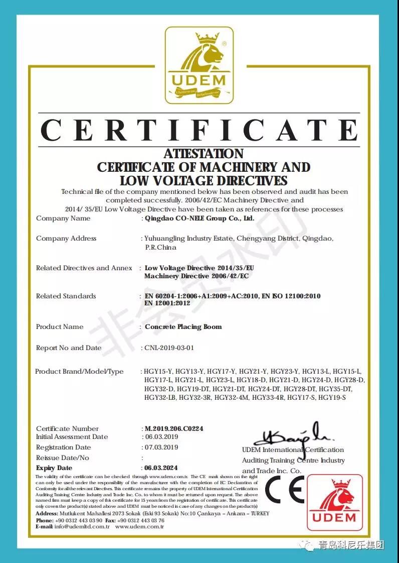 陽春三月,微風(fēng)習(xí)習(xí),科尼樂集團(tuán)的明星產(chǎn)品混凝土泵、混凝土布料機(jī)順利通過了歐盟CE認(rèn)證,這也代表著科尼樂集團(tuán)在提升產(chǎn)品品質(zhì)、拓展銷路、提升企業(yè)競(jìng)爭(zhēng)力方面邁入了新臺(tái)階。