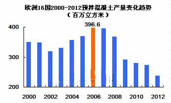 根據(jù)相關數(shù)據(jù)統(tǒng)計,2006年歐盟預拌混凝土年產(chǎn)量3.96億立方米,達到近年高峰值,之后產(chǎn)量逐年下降,2012年預拌混凝土年產(chǎn)量僅2.4億立方米。
