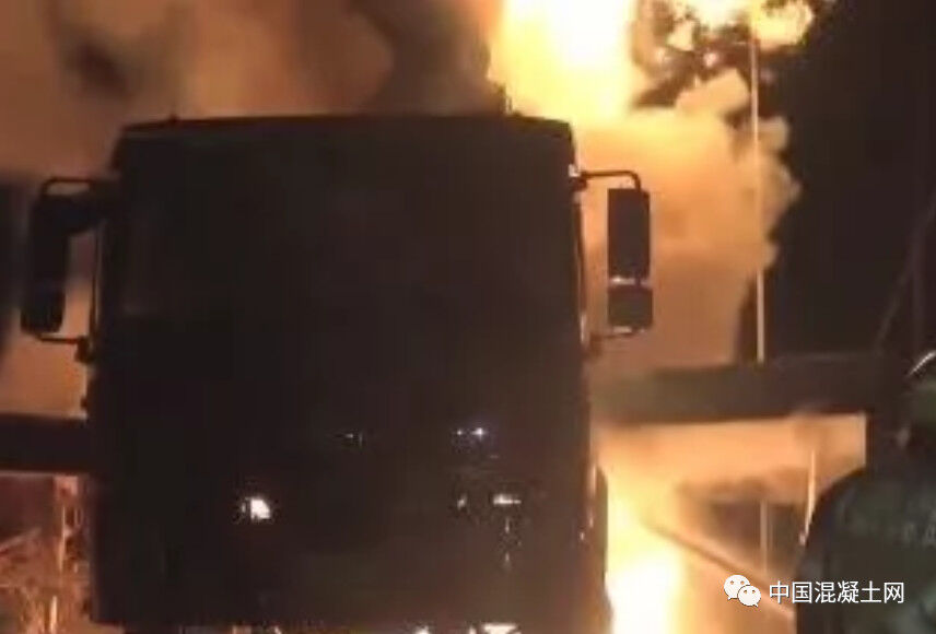 起火的混凝土泵車(chē)四個(gè)支撐柱張開(kāi),輸送混凝土的曲臂也伸展開(kāi)來(lái),整個(gè)車(chē)身被熊熊的大火包圍。泵車(chē)油箱破裂,大量的柴油外漏,現(xiàn)場(chǎng)卷起了5米多高的火舌。