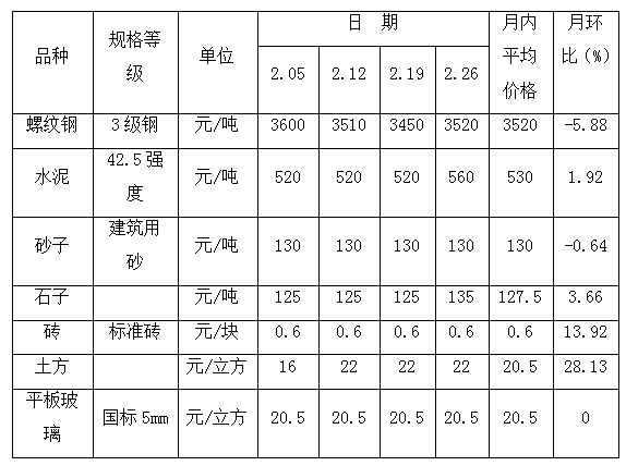 受春節(jié)假期和新冠肺炎疫情影響,2月份山東省濟寧市黃河灘區(qū)遷建物資市場交易量明顯減少,價格變動整體漲跌互現(xiàn)。與上月相比,7種黃河灘遷建物資價格呈4升2降1平態(tài)勢。其中,螺紋鋼的價格震蕩下行,水泥的價格穩(wěn)中有漲,砂子、磚和平板玻璃的價格月內(nèi)平穩(wěn)運行,石子的價格受季節(jié)性供應減少影響小幅上升,土方的價格呈現(xiàn)高位整理態(tài)勢。螺紋鋼方面,截止到2月26日,濟寧市梁山縣監(jiān)測的螺紋鋼市場批發(fā)價格為3520元/噸,價格下降明顯。由于目前特殊時期,貨運受阻且下游企業(yè)復工進度開展緩慢,短期內(nèi)需求仍然偏弱,市場整體成交冷清,庫存和資金壓力逐步增加,供給壓力放大,商家對于后市心態(tài)偏空,處于悲觀情緒,市場整體處于有價無市狀態(tài)。