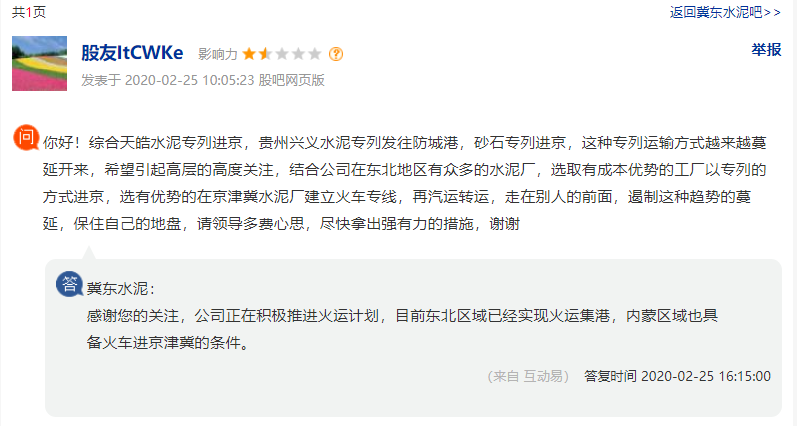 日前有股友在上市公司平臺向冀東水泥提問并建議:稱綜合天皓水泥專列進京,貴州興義水泥專列發(fā)往防城港,砂石專列進京,這種專列運輸方式越來越蔓延開來,希望引起高層的高度關(guān)注。