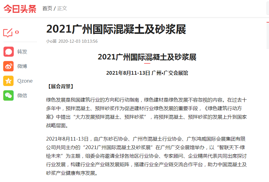 在此,小編就不一一列舉了,再次衷心感謝各大媒體對(duì)2021廣州國際混凝土及砂漿展的大力宣傳,為各地的混凝土、砂漿產(chǎn)品、設(shè)備代理商、經(jīng)銷商、承包商、進(jìn)出口貿(mào)易商等業(yè)內(nèi)人士等提供全面了解展會(huì)的平臺(tái)!