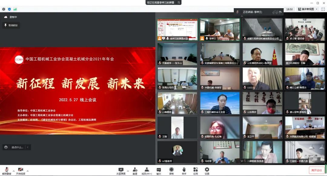 2022年5月27日,以“新征程 新發(fā)展 新未來(lái) ”為主題的中國(guó)工程機(jī)械工業(yè)協(xié)會(huì)混凝土機(jī)械分會(huì)年會(huì)在線上隆重召開(kāi)。中國(guó)工程機(jī)械工業(yè)協(xié)會(huì)會(huì)長(zhǎng)蘇子孟、名譽(yù)會(huì)長(zhǎng)祁俊、協(xié)會(huì)顧問(wèn)龍國(guó)鍵、副秘書(shū)長(zhǎng)呂瑩、副秘書(shū)長(zhǎng)王金星、副秘書(shū)長(zhǎng)尹曉荔、其他分支機(jī)構(gòu)領(lǐng)導(dǎo)、混凝土機(jī)械分會(huì)會(huì)長(zhǎng)符忠軒、名譽(yù)會(huì)長(zhǎng)盛春芳、秘書(shū)長(zhǎng)李祥蘭、顧問(wèn)易君、分會(huì)秘書(shū)處、分會(huì)理事及會(huì)員單位相關(guān)負(fù)責(zé)人、行業(yè)上下游企業(yè)與行業(yè)專家等在內(nèi)的兩百余人參與此次會(huì)議。