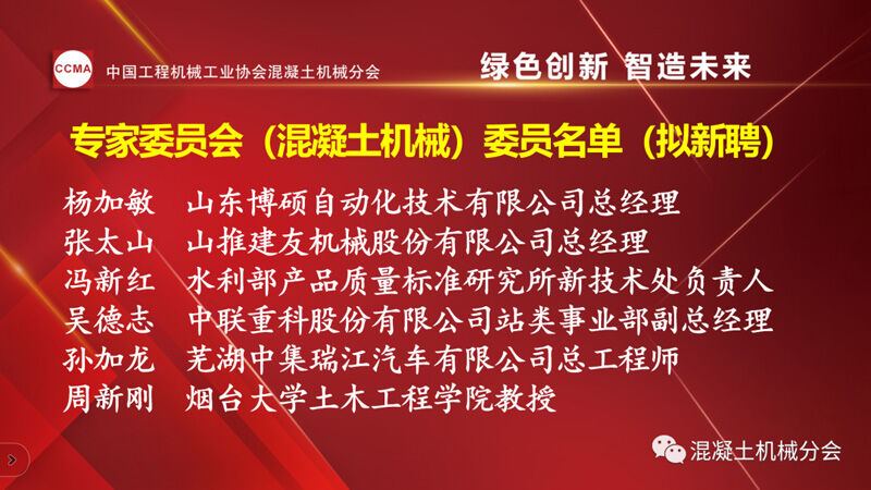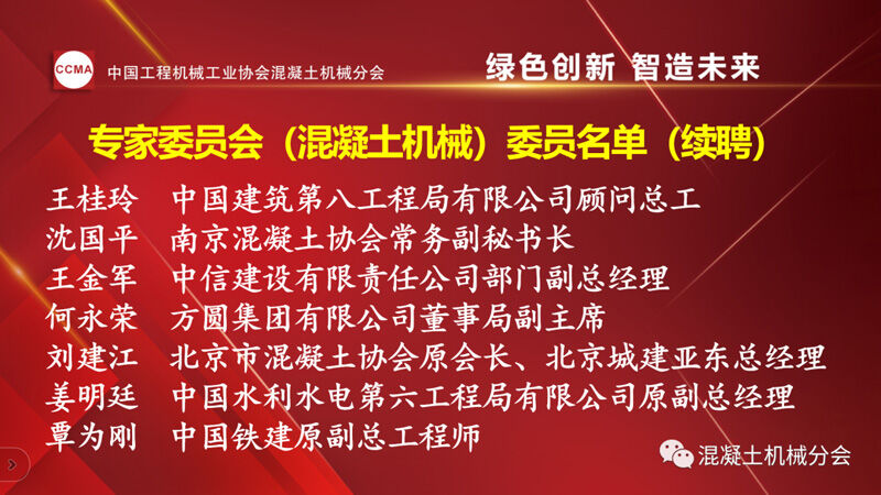 中國(guó)工程機(jī)械工業(yè)協(xié)會(huì)混凝土機(jī)械分會(huì)會(huì)長(zhǎng)符忠軒宣讀兩份通知。一份為《關(guān)于2022年中國(guó)工程機(jī)械工業(yè)協(xié)會(huì)專(zhuān)家委員會(huì)(混凝土機(jī)械)委員聘任的通知》,其中中國(guó)工程機(jī)械工業(yè)協(xié)會(huì)專(zhuān)家(混凝土機(jī)械)委員會(huì)(混凝土機(jī)械)續(xù)聘7位,新聘6位委員,共13位。