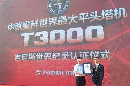 在交付儀式現(xiàn)場,英國吉尼斯世界紀錄認證官陳東先生鄭重宣布,T3000是全球最大的平頭塔機,由中國的中聯(lián)重科制造,再次創(chuàng)造了全球起重機械的又一個“世界之最”?!霸擁椨涗浀恼Q生標志著中聯(lián)重科塔機技術站在了世界塔機設計和制造領域的最前沿,充分彰顯了中聯(lián)重科在全球起重機行業(yè)的領先地位和主導作用”,國家建筑城建機械質量監(jiān)督檢驗中心主任曾舜安表示。