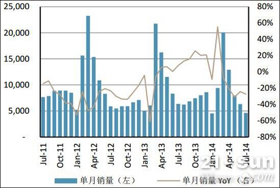 瑞銀表示,行業(yè)整體景氣度并未好轉(zhuǎn),下滑之勢未改。2013年4月開始,土方機械單月銷量增速由負轉(zhuǎn)正,其中挖機銷量在2013年四季度實現(xiàn)了超過20%的增長,裝載機在8月后亦實現(xiàn)了超過15%的月均銷量增長。但進入2014年以來,由于房地產(chǎn)銷售及新開工不佳,2014年3月,挖掘機和裝載機銷量分別下滑8%和4%,結(jié)束了11個月的正增長。此后4-7月,跌幅持續(xù)擴大,其中7月挖機銷量下降27%,裝載機銷量下滑20%。