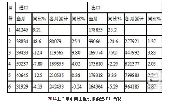 據(jù)海關(guān)總署統(tǒng)計,2014年上半年我國工程機械進(jìn)出口貿(mào)易額為120.66億美元,比上年增長0.64%。其中進(jìn)口金額24.24億美元,比上年下降0.24%;出口金額96.42億美元,比上年增長0.87%,貿(mào)易順差72.18億美元,同比擴(kuò)大8905萬美元。