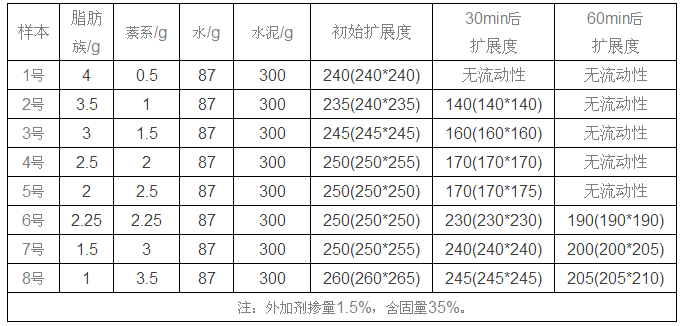 根據(jù)《混凝土外加劑勻質(zhì)性試驗(yàn)方法》GB/T8077-2012規(guī)定的試驗(yàn)方法:水泥300g;水87g。本文外加劑摻量按1.5%(即4.5g)為基準(zhǔn),逐步進(jìn)行調(diào)整,直至找到最優(yōu)復(fù)配比例。