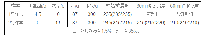從表1可以明顯看出,等量的脂肪族和萘系對“海螺牌”水泥的打開都無問題,初始差距不大。而經(jīng)時損失方面,1號樣本損失較快;2號樣本效果非常理想,由此可以判斷2號樣本即萘系對“海螺”水泥的適應(yīng)性較好。