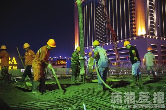 8月15日晚8時(shí),長沙萬家麗廣場對面,一輛水泥罐車開進(jìn)萬家麗路與荷花路交會(huì)處東南角。接著這輛罐車伸出高高的手臂,連續(xù)不斷地向萬家麗路高架輸送預(yù)拌混凝土,數(shù)十名工程技術(shù)人員在綁扎好鋼筋的最后一跨箱梁上嫻熟操作。上海城建市政集團(tuán)萬家麗路快速化改造工程項(xiàng)目副總指揮、項(xiàng)目經(jīng)理傅建平透露,15日晚8時(shí)至16日上午10時(shí),十名工程技術(shù)人員要完成120米橋面混凝土澆筑,到16日上午10時(shí),萬家麗路快速化高架主線結(jié)構(gòu)全面貫通。今年國慶節(jié),作為湖南長沙乃至湖南首條按照快速化改造的高架橋,將實(shí)現(xiàn)全面竣工通車。