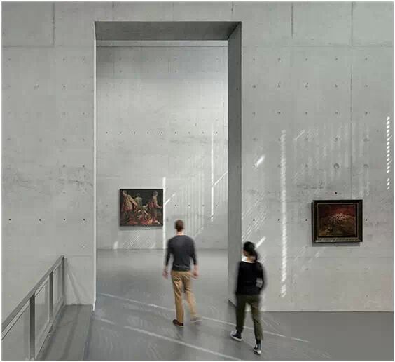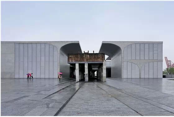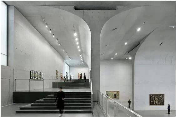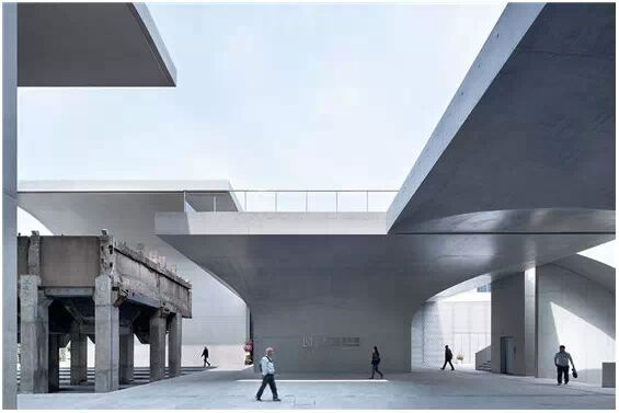 在“傘拱”結(jié)構(gòu)的空腔里,地面以上的“傘拱”覆蓋空間,墻體和天花均為清水混凝土的表面,它們的幾何分界位置也變得模糊。這樣的結(jié)構(gòu)性空間,在形態(tài)上不僅對人的身體形成庇護感,亦與保留的江邊碼頭的煤料斗產(chǎn)生視覺呼應(yīng)。建筑的內(nèi)部空間也得以呈現(xiàn)一種原始的野性魅力,而有著大小調(diào)節(jié)的空間尺度以及留有模板拼縫和螺栓孔的清水混凝土表面又會帶來一種現(xiàn)實感。這種“直白”式的結(jié)構(gòu)、材料、空間所形成的直接性與樸素性,加上大尺度出挑所產(chǎn)生的力量感或輕盈感,使整個建筑與原有場地的工業(yè)特質(zhì)間取得一種時間與空間的接續(xù)關(guān)系。地面以上的清水混凝土“傘拱”下的流動展覽空間和地下一層傳統(tǒng)“白盒子”式的展覽空間由一個呈螺旋回轉(zhuǎn)、層層跌落的階梯空間聯(lián)接,既原始又現(xiàn)實的空間和古代、近代、現(xiàn)代直到當(dāng)代藝術(shù)的展覽陳列,這種并置的張力,呈現(xiàn)出一種具有時間性的展覽空間。