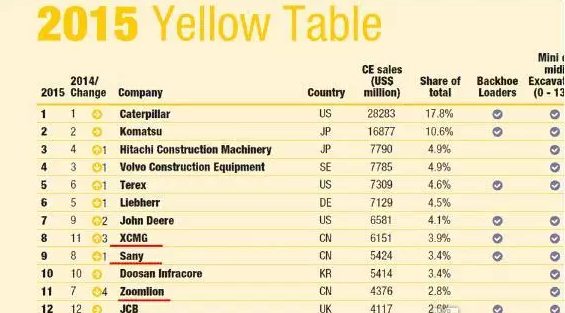 近日,世界領(lǐng)先的工程機械信息提供商——英國KHL集團(tuán)主導(dǎo)發(fā)布了2015年全球工程機械制造商50強排行榜(Yellow Table 2015)。徐工集團(tuán)、三一重工、中聯(lián)重科等多家中國企業(yè)均榜上有名,其中徐工集團(tuán)排名第八,位居中國企業(yè)首位。