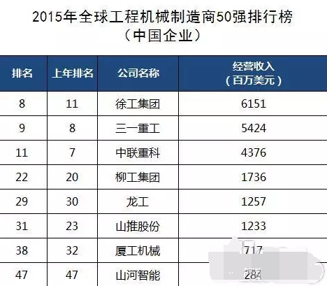 2015年全球工程機械制造商50強排行榜中國企業(yè)榜單