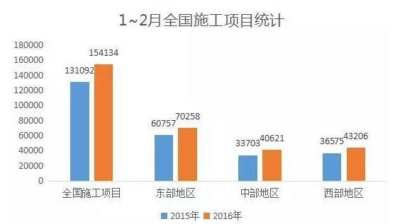 今年1~2月,全國(guó)施工項(xiàng)目154134個(gè),比去年同期增加23042個(gè)。其中,東部地區(qū)施工項(xiàng)目70258個(gè),增加9501個(gè);中部地區(qū)施工項(xiàng)目40621個(gè),增加6918個(gè);西部地區(qū)施工項(xiàng)目43206個(gè),增加6631個(gè)。