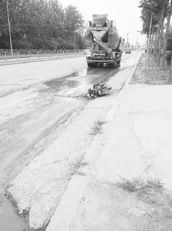 “這個(gè)女的騎著電動(dòng)車(chē),看起來(lái)30歲左右,開(kāi)攪拌車(chē)的司機(jī)是個(gè)男的,兩人都是由南向北同向行駛?!备浇患疑痰昀习甯嬖V記者,當(dāng)時(shí)兩人前面還有一輛灑水車(chē)在工作,電動(dòng)車(chē)和攪拌車(chē)都避開(kāi)了這輛灑水車(chē)?yán)^續(xù)行駛。