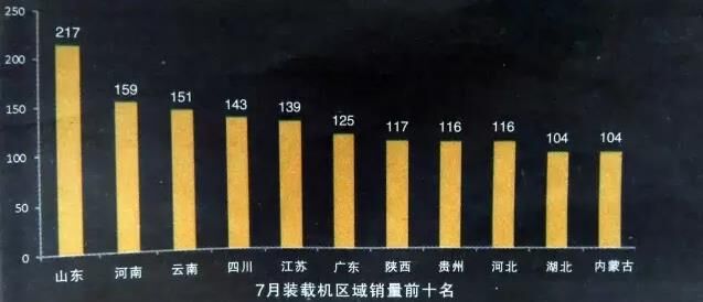 今年前7月,除2月份出口量不足800臺,其它月份出口數(shù)量基本均在1000~1300臺的區(qū)間內(nèi)上下波動,相對比較平穩(wěn)。分區(qū)域來看,山東省繼續(xù)保持領(lǐng)先,7月份銷量達(dá)到217臺,其余省份銷量均未達(dá)到200臺,天津、上海、青海、海南、西藏等仍是銷量最少的省、市、自治區(qū)。
