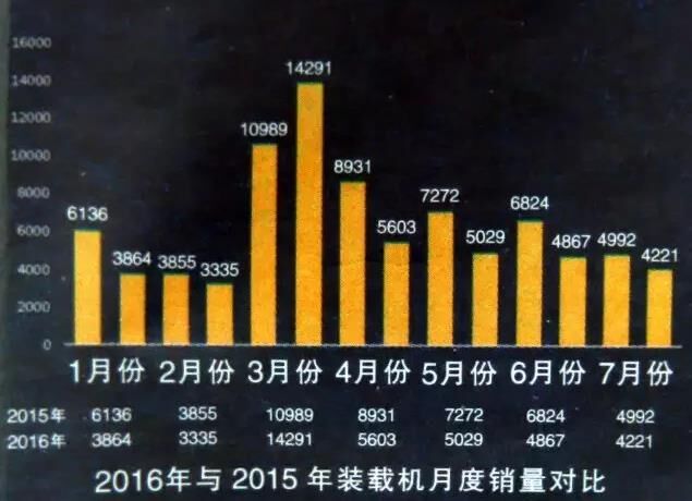 據(jù)公布的數(shù)據(jù),7月份全國26家主要裝載機(jī)生產(chǎn)企業(yè)共銷售各類裝載機(jī)4221臺,同比2015年7月份的4992臺,下降15.44%;環(huán)比6月份的4867臺,下降13.27%。其中3噸及以上裝載機(jī)銷量為3796臺,3噸以下小型裝載機(jī)銷量為425臺。從細(xì)分類型來看,3噸及5噸裝載機(jī)為主力銷售機(jī)型,合計銷量占比達(dá)到80%。綜合來看前7月銷量,除3月份曇花一現(xiàn)般同比大幅增長30.05%外,其余月份裝載機(jī)銷量均在下滑。但一個積極的現(xiàn)象是,4月份以來裝載機(jī)雖持續(xù)下滑,但降幅一直在收窄,自4月份的37.26%收窄到7月份的15.44%。