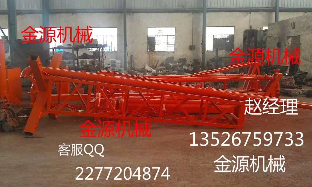 結構:、插銷⒁、立架⑵、構成的底座是固定部分,其上通過回轉支承⑶與上部回轉部分相連,上主梁架⑼、平衡臂⑸、平衡臂架拉桿⑹、上橫桿⑽組成后回轉部分。立管⑻上有回轉卡篐接頭。通過人力拉動,可使整個回轉部分回轉360度。上梁主架⑼前端連接有一個回轉支座⒂與前橫桿⑿、前拉桿⑾組成前回轉部分,在人力拉動下可繞回轉支座⒂旋轉300度。由兩部分回轉架組成的合成運動就能覆蓋所有布料半徑范圍的布料點。