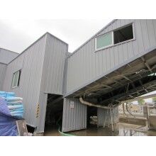 1)料廠封裝:立柱采用4∠50*5角鋼,立柱角鋼間的橫向聯(lián)系及斜撐采用∠30角鋼;拱架采用Φ48*2mm鍍鋅鋼管,斜撐及聯(lián)系采用Φ21*1.5mm鍍鋅鋼管及∠30角鋼。屋面檁條采用12#鍍鋅C型鋼。屋面彩鋼棚采用0.3mm厚藍(lán)色彩鋼板,頂棚排水采用630*1.2mm鍍鋅檐溝。圍擋檁條采用12#鍍鋅C型鋼,斜撐采用Φ16mm的圓鋼拉筋,彩鋼棚采用0.3mm厚藍(lán)色彩鋼板。