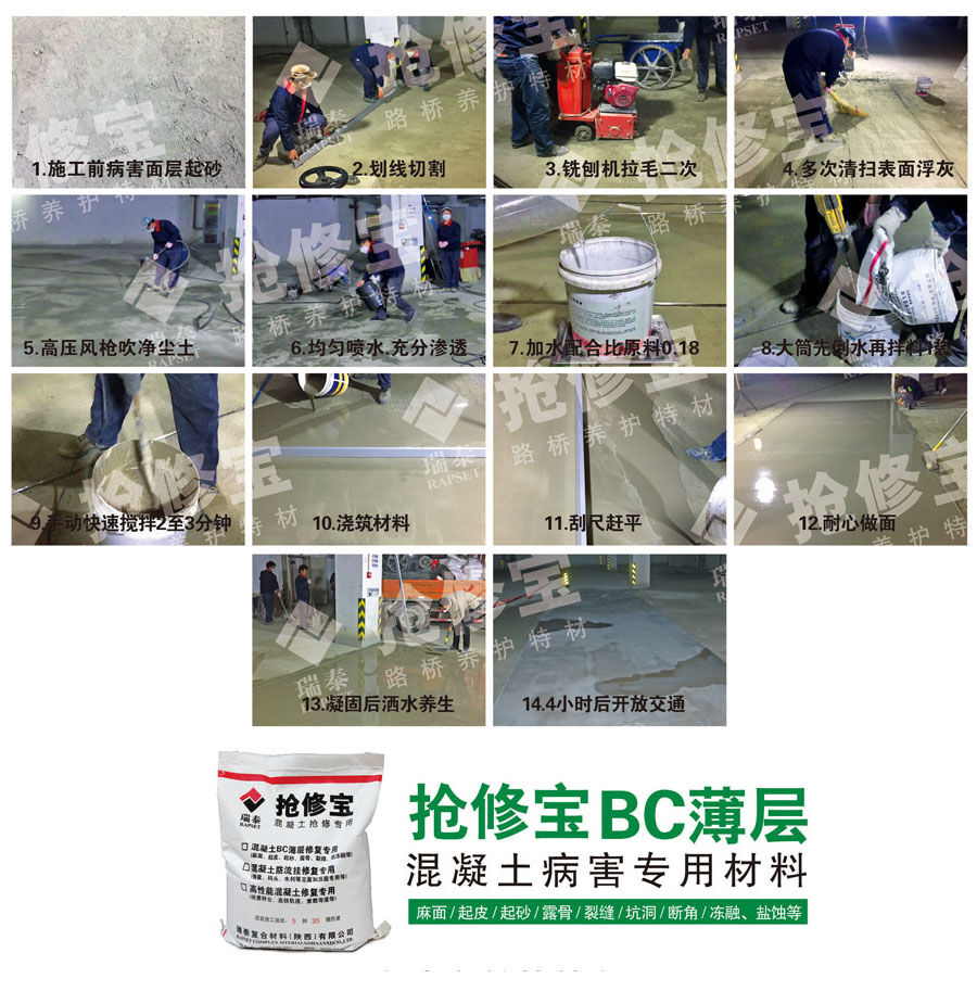 出現(xiàn)這些問題的主要原是因為施工質(zhì)量和產(chǎn)品本身的使用壽命問題,那么針對這種問題,地坪在修補處理基層時應該選擇什么材料呢?首先應考慮快速材料,因為是地下停車場,車輛需要頻繁進入駛出;其次針對起塵、起砂、脫落的微表處病害,選擇針對微表處病害的修補材料。搶修寶BC薄層就是一個不錯的選擇,材料本身強度高,內(nèi)含進口膠粉,可以和病害部位嚴絲合縫的結合起來,其次加入了進口添加劑,材料可以30分鐘完成初凝,2-4小時就可以恢復交通,解決了車輛進出頻繁引起的交通擁堵,是地坪修補基層處理的的不錯的選擇!