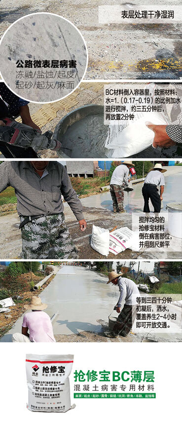 搶修寶BC薄層修補(bǔ)材料,可實(shí)現(xiàn)3毫米以上的超薄層快速修補(bǔ),美觀度高,而且具有防凍和抗腐蝕性能。農(nóng)村公路的起砂病害用搶修寶BC薄層修補(bǔ)材料進(jìn)行修補(bǔ),受到了甲方及施工單位的認(rèn)可,并且建立長期合作。