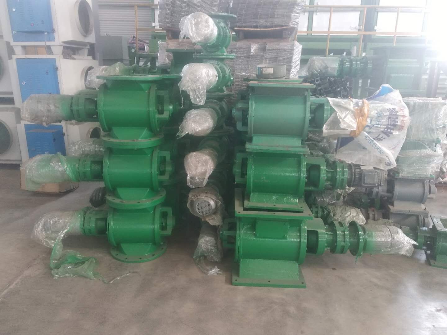 工作原理:星型卸料器工作時,粉塵靠重力落入,充滿上面和側(cè)面的星形葉片空格。葉片轉(zhuǎn)子由電動機通過減速機轉(zhuǎn)動軸帶動,葉輪轉(zhuǎn)到下部粉塵靠自重卸下。這種卸塵器一般都安裝在除塵器灰斗下部,為保證連接處的嚴(yán)密不漏風(fēng),在回轉(zhuǎn)卸料器的上部應(yīng)經(jīng)常保持(儲存)一定高度的粉塵。因為葉輪轉(zhuǎn)動時,卸完粉塵后葉輪轉(zhuǎn)上的那一面經(jīng)常是沒有粉塵的,所以容易使空氣漏入。為了保持一定高度的灰柱,而且不致卸空,*在灰斗內(nèi)裝設(shè)料位信號設(shè)施,并與卸塵閥的電動機建立連鎖。