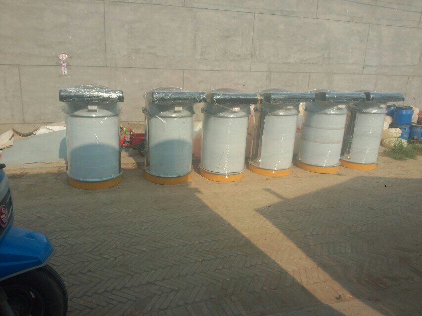 單機(jī) 屬于機(jī)械抖動(dòng)除塵器,其基本結(jié)構(gòu)由風(fēng)機(jī)、過濾器和集塵器三個(gè)部分組成,各部件都安裝在一個(gè)立式框架內(nèi),鋼板殼體,烘漆防銹,運(yùn)行可靠,使用方便。風(fēng)機(jī)采用離心風(fēng)機(jī),風(fēng)量大,風(fēng)壓高,并采用消聲措施,噪音小。過濾器采用扁布袋組,每個(gè)布袋內(nèi)裝有彈簧鋼絲網(wǎng),過濾效果好。清灰機(jī)構(gòu)采用電動(dòng)機(jī)帶動(dòng)偏心輪、連桿使布袋抖動(dòng)而   沾在濾袋表面的粉塵。此除塵器設(shè)有檢修門,方便檢修和換袋。