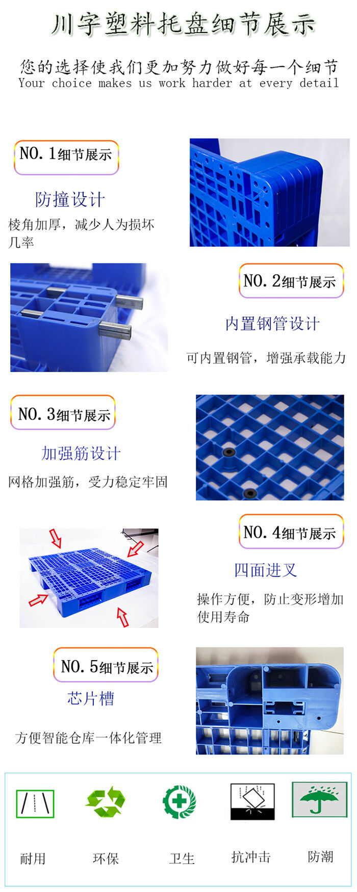 使用方式:本公司生產的塑料托盤通過ISO9001:2000質量體系認證,具有安全、衛(wèi)生、環(huán)保,使用壽命長、使用便捷、、無釘無刺、無味無毒、耐酸、耐堿、耐腐蝕,易沖洗消毒、不腐爛、不助燃、無靜電火花、耐高溫、耐低溫、可回收、質量輕、美觀、強度高等特點,主要原料為進口聚乙烯,是現代運輸、倉儲、包裝的重要工具。根據國際潮流,吸取日本德國技術,結構設計合理,標準系列塑料托盤是用途*為廣泛的一種,可在地面使用堆垛,四向進叉。