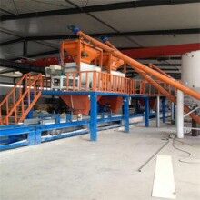 混合好的干粉由提升機(jī)提升到砂漿混合機(jī)頂部的粉料和水配料秤,按配方配好砂漿和水,進(jìn)入混合機(jī)混合均勻,打開卸料門進(jìn)入到布料機(jī)。
