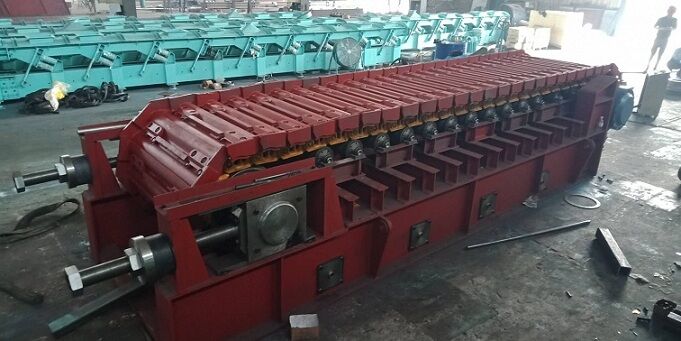 牽引鏈采用配套廠家的履帶鏈,節(jié)距誤差小,強(qiáng)度高,不宜變形,并且在使用期內(nèi)無須潤滑,日常操作維修方便快捷。鏈板底全部采用錳鋼板制作,采用單圓弧搭接結(jié)構(gòu)形式,工作時始終處于相互搭接狀態(tài)??箾_擊,耐磨損,鏈板之間不漏料,安全可靠。每個鏈板兩側(cè)采用導(dǎo)向板定位,通過8個螺栓與履帶鏈牢固連接,保證了鏈板相互之間咬合準(zhǔn)確。鏈板底板下面焊有加強(qiáng)筋板,鏈板運行時有四列滾輪支撐,可保證承受大的物料沖擊而不變形。整機(jī)現(xiàn)場的粉塵、噪音狀況大為改善,工人操作環(huán)境得到了明顯改進(jìn)。