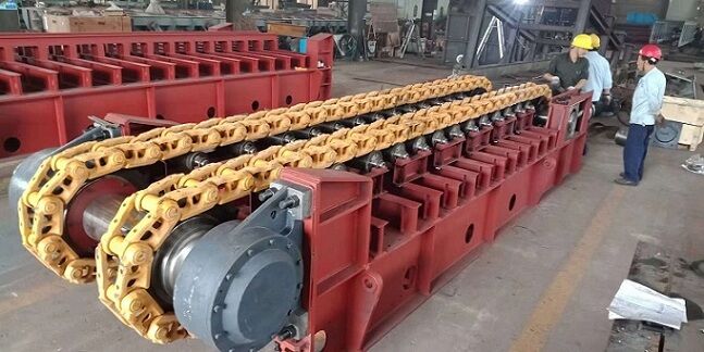 由于板喂機是通過鏈輪、鏈條、鏈板、傳動等一系列全鋼結構的剛性機架將物料拖出庫底的。所有的料倉壓力由板式給料機承擔,避免的由于料倉壓力過大把皮帶秤壓壞現(xiàn)象。