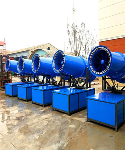 除塵噴霧炮是根據(jù)送風原理,先使用進口高壓泵、微細霧化噴嘴將水霧化,利用風機風量和風壓將霧化后的水霧送到較遠距離,使得水霧到達較遠距離能夠覆蓋大面積,水霧與粉塵凝結(jié)后降落,從而達到降塵目的。