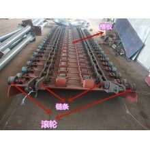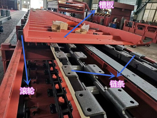 板式給料機運行部件由牽引鏈條,承載構(gòu)件行走滾輪和輸送槽板等組成。