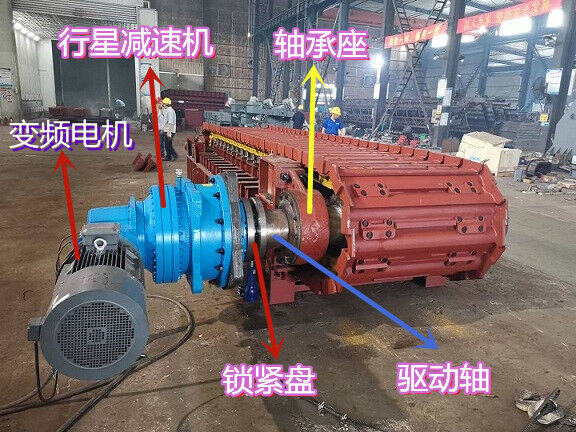 主軸驅動裝置由1根頭部驅動軸,2個軸承座,2個驅動鏈輪,1個鎖緊盤,變頻電機和行星減速機等組成。(見下圖)