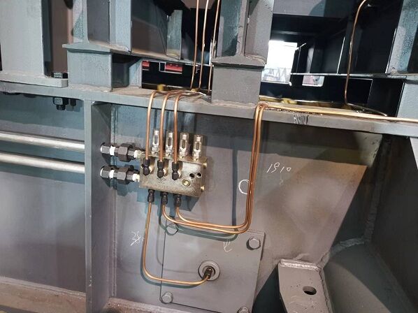重型板式給料機(jī)潤(rùn)滑系統(tǒng)由儲(chǔ)油罐、油泵、閥門、潤(rùn)滑管路、油壓傳感變送器和PLC控制器組成。由于板式給料機(jī)的潤(rùn)滑口較多,若采用單一管路同時(shí)對(duì)各潤(rùn)滑口注入潤(rùn)滑脂,不但會(huì)使油泵的功率和主管路的壓力增加,而且各潤(rùn)滑口施加的壓力不均勻,影響潤(rùn)滑效果。因此,本系統(tǒng)采用分段潤(rùn)滑的方法,用電磁閥控制各個(gè)潤(rùn)滑管路。該系統(tǒng)有油泵電.機(jī),油壓傳感變送器,潤(rùn)滑管路總閥門,4個(gè)分段潤(rùn)滑管路分閥門等組成。由于電磁閥安全、控制方便,可靠性高,系統(tǒng)均采用電磁閥。重型板式給礦機(jī)自動(dòng)潤(rùn)滑系統(tǒng)應(yīng)滿足以下控制要求:
