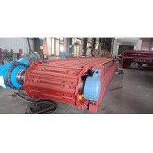 座部件由機架和支承件組成。機架由鋼材焊接而成,支承部件有支重輪、下托輪和縱向?qū)к?,輸送板得到支重輪和縱向?qū)к壍碾p重支持,使支重更均勻合理。牽引鏈基本上不受礦石和自重產(chǎn)生的張力作用,支重輪外側(cè)設計有凸臺,與主、從動輪聯(lián)合作用,成功地杜絕鏈軌跑偏。在機架下方設有下托輪,為方便維修,下托輪為側(cè)裝式。