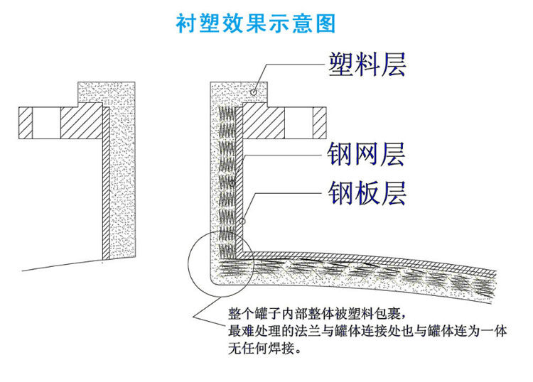 鋼襯塑聚乙烯儲罐:以純聚乙烯(PE)為原料,使用熱融滾塑工藝將聚乙烯內(nèi)襯于鋼罐體內(nèi)壁,鋼罐體內(nèi)網(wǎng)(龜甲)與聚乙烯有機結合成一體,使聚乙烯牢固過渡連接鋼體內(nèi)表面,內(nèi)襯聚乙烯防腐層厚度可根據(jù)實際需要而定,內(nèi)襯聚乙烯防腐層厚度可在15-25mm不等。