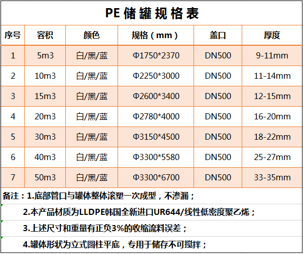 所用材質(zhì)為韓國進口聚乙烯(PE)滾塑原料,儲罐一次成型,內(nèi)外光滑,具有良好的衛(wèi)生性與抗紫外線能力,耐酸堿、耐腐蝕、易清洗、不易老化。它可以盛裝在常溫下無機酸、堿、鹽等大部分物質(zhì)及有機物,耐熱耐凍 耐熱耐凍性佳,-5℃—+85℃均可使用
