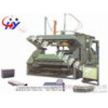 靜停養(yǎng)護(hù)達(dá)到切割強(qiáng)度后,??蛴煞D(zhuǎn)行車吊運至切割機(jī)工位上,翻轉(zhuǎn)吊具將??蚍D(zhuǎn)90°放在切割小車支座上,然后由翻轉(zhuǎn)吊具機(jī)械手自動開啟???、脫模,把坯體連同側(cè)板側(cè)立在第一輛切割小車上,脫下的模框清理后與蒸養(yǎng)返回的經(jīng)清理噴油后的側(cè)板組合成模具,等待澆注。在組模的同時,脫模后的坯體在切割機(jī)上分部做定點切割,首先第一輛切割小車帶動坯體行走經(jīng)過縱切裝置進(jìn)行縱向切割,坯體在進(jìn)行縱向切割時,分別由切割刀片和由汽缸張緊的切割鋼絲同時完成側(cè)面、面包頭及頂面廢料的切割與清理,縱切結(jié)束后,切割小車?yán)^續(xù)行走至橫切裝置中央位置停止,橫切架自上而下垂直降落進(jìn)行坯體的橫向切割,橫切時切割鋼絲作鋸裝擺動,完成坯體的鋸裝橫向切割。坯體切割完成后,人工推鏟出去頂部面包頭。小車置換裝置啟動,由切割機(jī)下方小車置換油缸將切割好的坯體連同側(cè)板頂起,下方第一輛小車返回起始位置,去承載新的帶切割的坯體,第二輛小車替換第一輛小車位置,并承載坯體及側(cè)板行走至預(yù)定位置,最后坯體由半成品吊車連同地板吊運至釜前蒸養(yǎng)小車上,在軌道上進(jìn)行編組。
